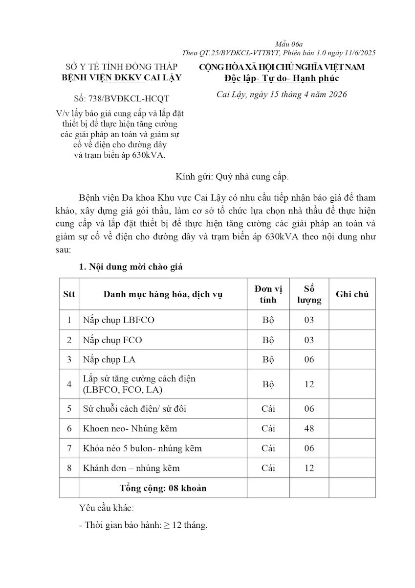 Bệnh viện Đa khoa khu vực Cai Lậy mời các nhà cung cấp có quan tâm, có khả năng cung cấp hàng hóa báo giá theo danh mục và biểu mẫu chào giá với các nội dung như sau: