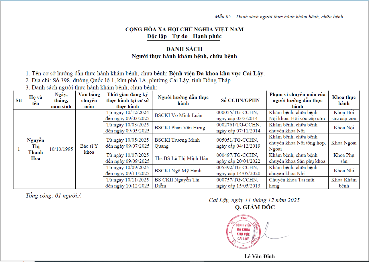 Danh sách người thực hành khám bệnh, chữa bệnh ngày 11/12/2025