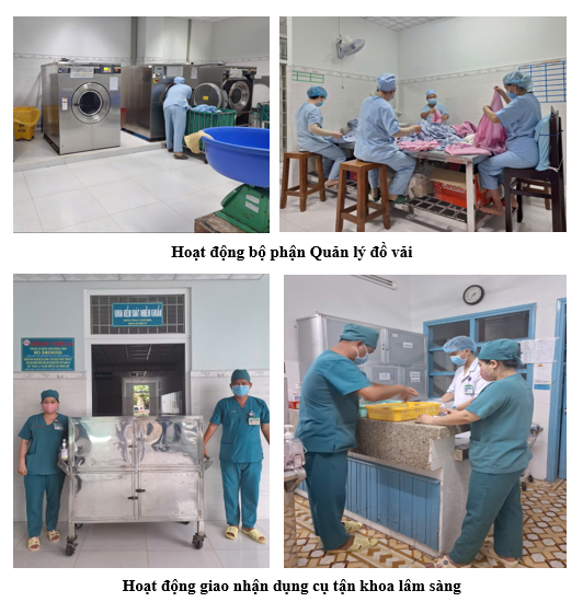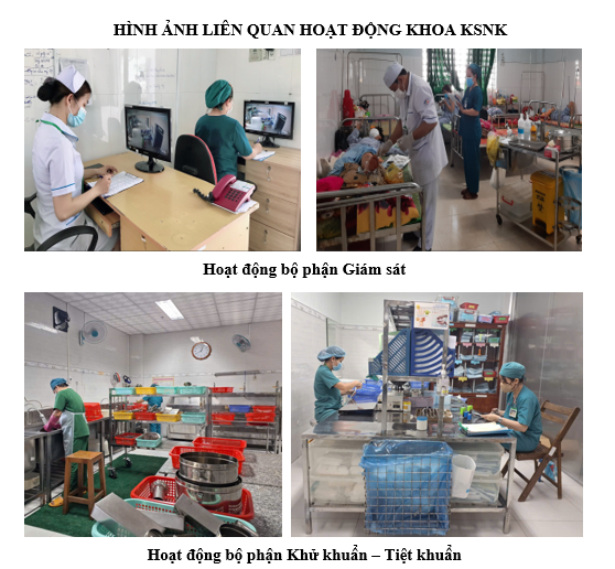 I. Thông tin chung: 1. Lịch sử hình thành và phát triển: Khoa Kiểm soát nhiễm khuẩn là khoa cận lâm sàng, được thành lập năm 1999 tại Quyết định 560/QĐ-YT ngày 10/8/1999 của Sở Y tế Tiền Giang (cũ) về việc thành lập khoa Chống nhiễm khuẩn Bệnh viện ĐKKV Cai Lậy. Đến năm 2010 khoa được đổi tên thành khoa Kiểm soát nhiễm khuẩn tại Quyết định số 108/QĐ-TC ngày 01/7/2010 của Giám đốc bệnh viện ĐKKV Cai Lậy về việc đổi tên khoa Chống nhiễm khuẩn thành khoa Kiểm soát nhiễm khuẩn. Hoạt động ban đầu đơn thuần là cung cấp gòn gạc thành phẩm theo yêu cầu lâm sàng; xử lý đồ vải dơ; hấp dụng cụ, gòn gạc và đồ vải phẫu thuật. - Từ năm 2014 khoa từng bước tổ chức triển khai nhiệm vụ của khoa theo hướng dẫn Thông tư 18/2009/TT-BYT ngày 14/10/2009, Thông tư 16/2018/TT-BYT ngày 20/7/2018 và các văn bản hiện hành về kiểm soát nhiễm khuẩn. Là đầu mối triển khai thành công dự án hỗ trợ xử lý chất thải bệnh viện; tham mưu Ban Giám đốc thực hiện khá đầy đủ các quy định pháp luật về bảo vệ môi trường. - Hoạt động chuyên môn bộ phận khử khuẩn - tiệt khuẩn và quản lý đồ vải đã có quy trình và sự chuẩn mực cơ bản phù hợp các quy định hiện hành, cơ sở vật chất của bệnh viện. Các số liệu hoạt động được quản lý qua từng năm. 100% dụng cụ y tế tái sử dụng được xử lý tập trung, từng bước triển khai quản lý dụng cụ tập trung. - Hoạt động giám sát kiểm soát nhiễm khuẩn phù hợp mô hình hoạt động của bệnh viện được triển khai thường quy: giám sát tuân thủ thực hành KSNK, nhiễm khuẩn vết mổ, đề kháng kháng sinh và vi khuẩn kháng thuốc... 2. Cơ cấu tổ chức: - Tổng số VC và NLĐ: 23 trong đó chức danh chuyên môn như sau: CNĐD: 04, Bs: 01, KSMT: 01, DSĐH: 01, CĐĐD: 05, Trung cấp: 2, khác: 09. + Viên chức quản lý: Trưởng khoa và Điều dưỡng trưởng. + 03 bộ phận chuyên môn: Giám sát; Khử khuẩn - tiệt khuẩn; Quản lý đồ vải. Phân công cụ thể như sau: Bộ phận giám sát: 04 VC gồm 1 Bác sĩ y học dự phòng là trưởng bộ phận giám sát; 01 CNĐD (ĐDT) và 2 CĐĐD là thành viên. Bộ phận Khử khuẩn - tiệt khuẩn: 10 VC gồm ĐD- Ys- NHS- sơ cấp ĐD trong đó có 01 trưởng bộ phận. Bộ phận Quản lý đồ vải: 08 hộ lý - nhân viên phục vụ trong đó có 1 trưởng bộ phận. + Ngoài ra, 01 KSMT phụ trách công tác quản lý chất thải y tế của bệnh viện.