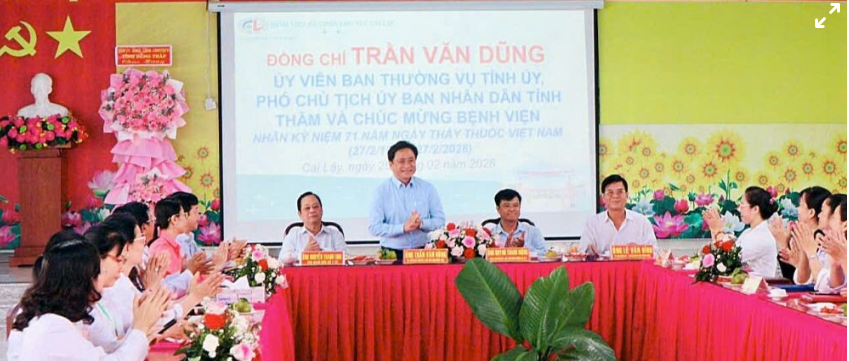 Chiều ngày 25/02/2026, ông Trần Văn Dũng - Ủy viên Ban Thường vụ Tỉnh ủy, Phó Chủ tịch thường trực UBND tỉnh Đồng Tháp cùng với các thành viên đoàn đã đến thăm và chúc mừng Bệnh viện Đa khoa khu vực Cai Lậy nhân kỷ niệm 71 năm Ngày Thầy thuốc Việt Nam (27/02/1955-27/02/2026). Tham gia cùng với đoàn có ông Nguyễn Thanh Linh - Phó Giám đốc Sở Y tế tỉnh Đồng Tháp; ông Nguyễn Công Minh Phó Chánh Văn phòng UBND tỉnh và Bà Phạm Hồng Ngọc Phó phòng Khoa giáo - Văn xã, về phía lãnh đạo địa phương có ông Huỳnh Thanh Mộng - Phó Bí thư Đảng ủy, Chủ tịch UBND phường Cai Lậy